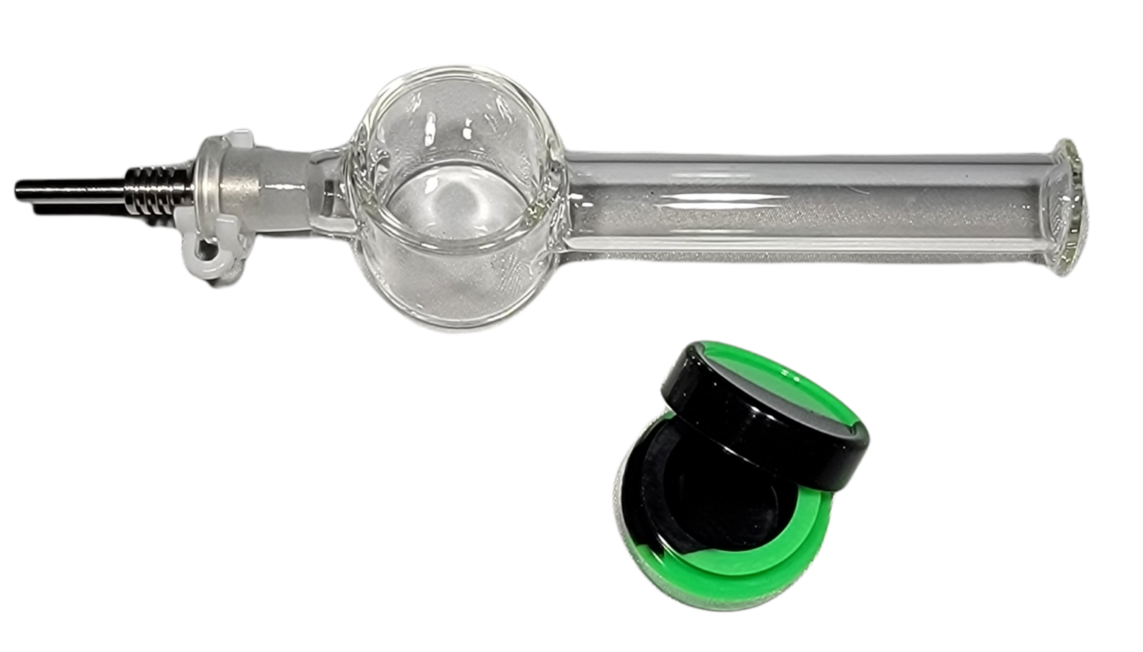 This is one of the more unique nectar collectors available on the market. It is awesome because it functions like a regular nectar collector and also has a built in reclaim catcher to make sure no material gets wasted. Without the dab nail, this nectar collector measures 5-6 inches in length. A plastic clip is included with this to ensure the dab nail does not fall out when in use. This nectar collector with reclaim catcher also includes the silicone dish attachment. So in all you get the nectar collector with reclaim catcher, silicone dish, and glass dab nail.