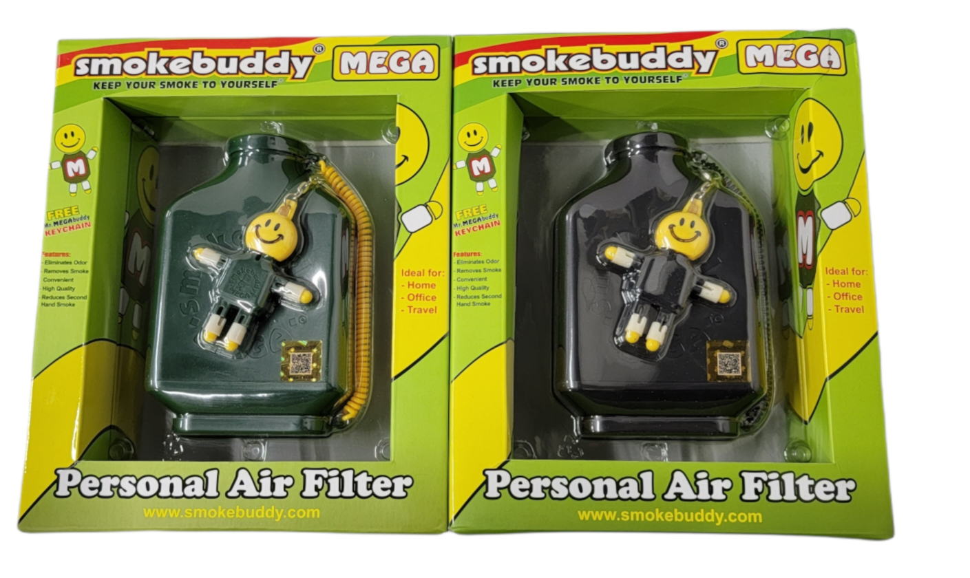 The Smokebuddy MEGA is our largest personal air filter. Designed with a filter twice as large as the Original Smokebuddy. The flat shape fits in your hand and looks great. Every Smokebuddy MEGA includes a MEGA size Mr. MegaBuddy LED keychain that will light up when you squeeze him.Smokebuddy MEGA will last the heavy users months and possibly years. The Smokebuddy MEGA is a handy, and reliable, life saving air filter. Simply exhale your smoke through your easy-to-use Smokebuddy MEGA and odorless air comes out the other end. Smoke where you want, and when you want without anyone knowing the wiser. Keep second hand smoke away from friends, family, and neighbors with your Smokebuddy MEGA.