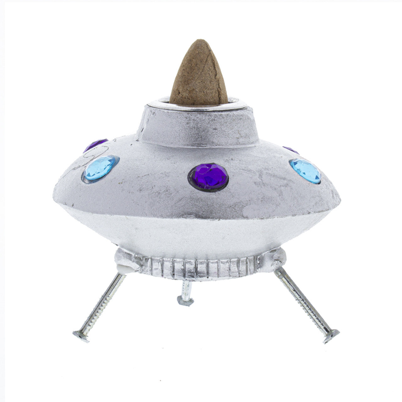 This flying saucer incense holder is one fantastic little craft. It is a simple but excellent backflow function incense burner with a silvery finish and tiny nails for feet that keep it slightly hovering off the ground. There’s a little hole on the bottom of the craft, so the smoke from your favorite incense comes out the bottom like it’s about the blast-off! There are little plastic rhinestone jewels around the edge in alternating colors to give it that sci-fi ✨sparkle.