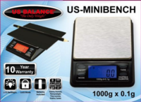 The US Balance Mini Bench is a unique portable pocket size scale. This little weigh scale weighs in gram, ounce, troy ounces, pennyweights, carat & grain. With a capacity of 1000g and a resolution of 0.1g It features a small stainless steel weighing platform, expansion tray, weighing container and bright LCD display.