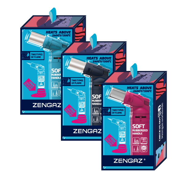 One of our best-sellers. Includes a powerful alternating flame (between soft and jet flame), a flame-lock switch, and a removable stand that can be customized upon request to include a silicon container.